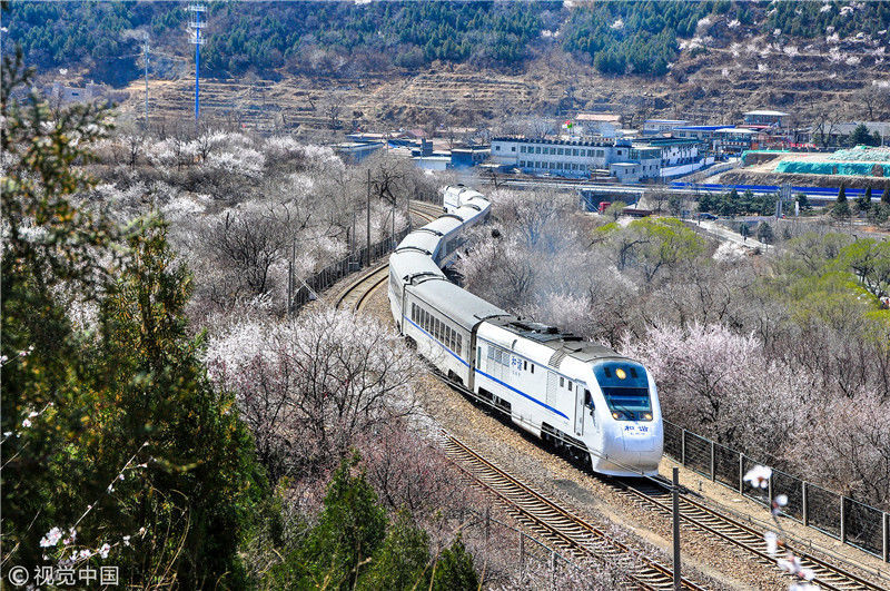 2019年3月22日,北京居庸關(guān)附近的山花盛開(kāi),S2線列車(chē)穿行在花海之中,構(gòu)成一幅美麗的畫(huà)面。