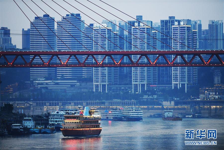 這是4月7日拍攝的重慶朝天門長江大橋一帶景象。 千里為重,廣大為慶。城在山水間、山水在城中,重慶頗具特色的立體城市景觀是城市靚麗的名片。 新華社記者 王全超 攝