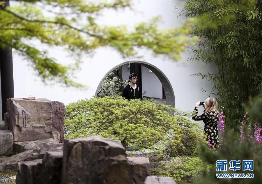 2017年4月27日,游客在美國紐約寄興園內(nèi)拍照。仿照中國蘇州園林設(shè)計(jì)建造的寄興園位于紐約斯塔滕島,占地面積約4000平方米,其所用的建筑材料大都在蘇州加工制造,并由40名來自蘇州的藝術(shù)家和工匠歷時(shí)6個月在紐約修建而成。 新華社記者王迎攝