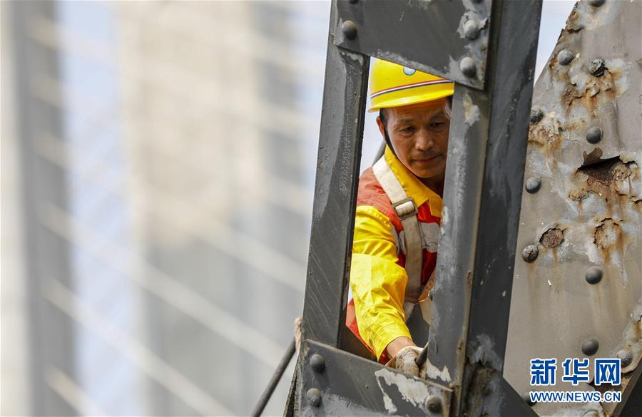 中國鐵路成都局有限公司重慶工務(wù)段53歲的橋隧工唐金華在白沙沱長江大橋的鋼架上檢查鋼梁的銹蝕情況(4月23日攝)。 4月23日下午5點40分,隨著重慶白沙沱長江大橋通行的最后一列客運列車順利通過,這座“服役”了59年的重慶首座長江大橋進入“退役”倒計時。4月24日后,所有列車將改線經(jīng)距白沙沱長江大橋約100米的新白沙沱長江特大橋通行,新橋“接力”老橋,運輸能力將得到大幅提升。 白沙沱長江大橋于1958年開工,1960年通過首趟列車,是繼武漢長江大橋之后的第二座長江大橋。 新華社記者 劉潺 攝