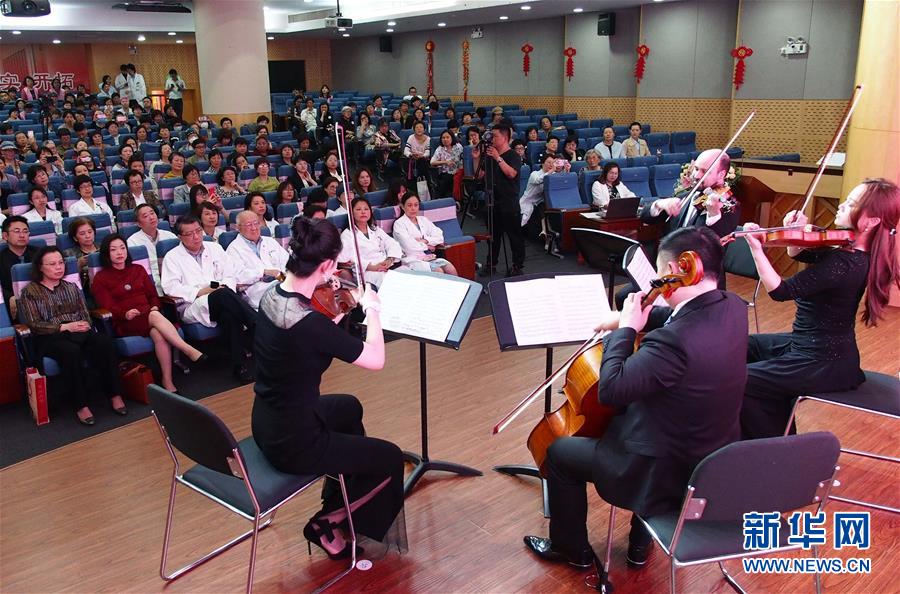 4月25日,上海交響樂團(tuán)的藝術(shù)家在復(fù)旦大學(xué)附屬腫瘤醫(yī)院為患者和醫(yī)護(hù)人員演奏。 當(dāng)日,第一場(chǎng)“全城交響·上交為你而來”音樂會(huì)在復(fù)旦大學(xué)附屬腫瘤醫(yī)院報(bào)告廳奏響,為患者及醫(yī)護(hù)人員獻(xiàn)上一場(chǎng)專屬音樂會(huì)?!叭墙豁憽ど辖粸槟愣鴣怼笔巧虾=豁憳穲F(tuán)2019年向全上海的機(jī)構(gòu)及個(gè)人開放的公益演出項(xiàng)目。 新華社記者 任瓏 攝