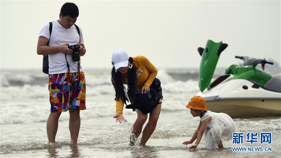 這是來自重慶的游客在銀灘戲水(4月18日攝)。 新華社記者張愛林?jǐn)z