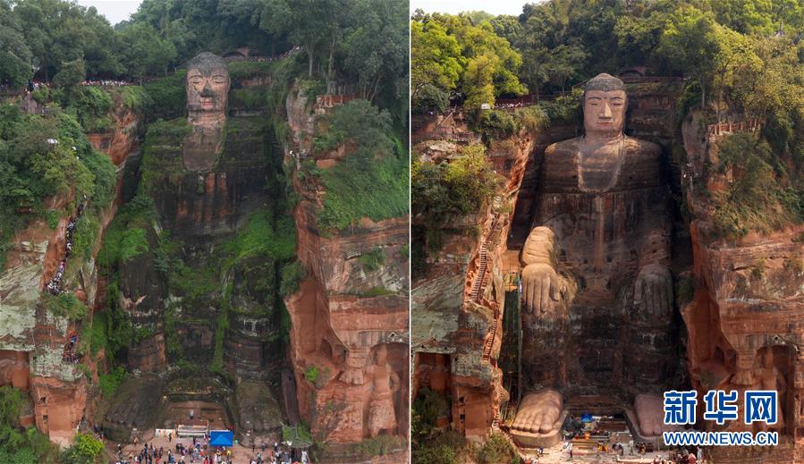 這是一張拼版照片:左圖為體檢與搶救性修復(fù)工作前的樂山大佛(2018年10月4日無人機(jī)拍攝);右圖為體檢與搶救性修復(fù)工作后的樂山大佛(3月29日無人機(jī)拍攝)。新華社記者 江宏景 攝