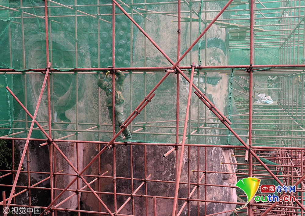 12月13日,四川樂山大佛周圍搭建腳手架已經(jīng)到達(dá)大佛頭部,10多名工人穿梭于搭建的腳手架之間,工人用綠色防護(hù)網(wǎng)繞腳手架將大佛圍住。從2018年10月8日截至今日,經(jīng)過66天的緊張施工,用了近兩千根6米長鋼管搭建腳手架,搭建的腳手架總重量達(dá)45噸,鋼管的總長度加起來達(dá)到11700米,而圍在腳手架外的防護(hù)網(wǎng)則使用了2000平方米左右。目前,包括頭部在內(nèi)的樂山大佛本體已被全部遮蔽。