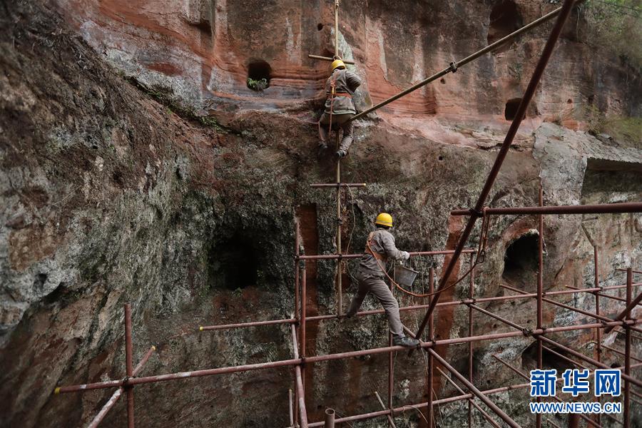 中鐵西北科學(xué)研究院有限公司文保中心的工作人員對大佛巖體進(jìn)行保護(hù)性清理(3月17日攝)。新華社記者 江宏景 攝