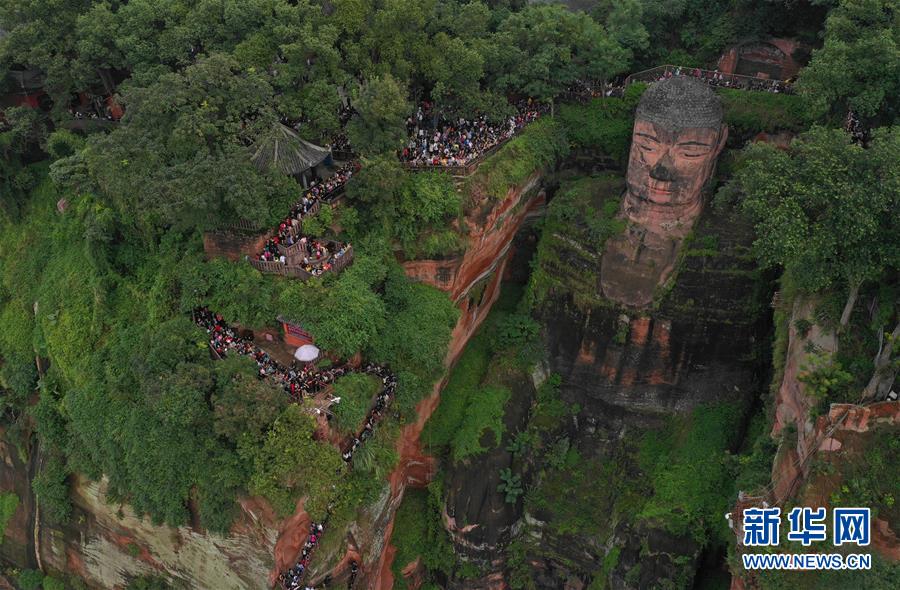 10月4日,游客在樂山大佛前排隊(duì)一睹大佛真容(無人機(jī)拍攝)?!⌒氯A社記者 江宏景 攝