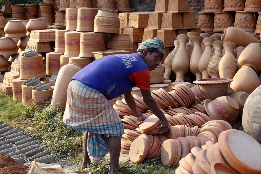達(dá)卡遠(yuǎn)郊區(qū)一個(gè)印度教徒聚居的村莊,幾乎家家戶戶都開辦制陶作坊,以傳統(tǒng)工藝制作陶盆、陶罐、陶盤和建筑裝飾陶器,遠(yuǎn)銷孟加拉國內(nèi)各地。李仁奇 攝