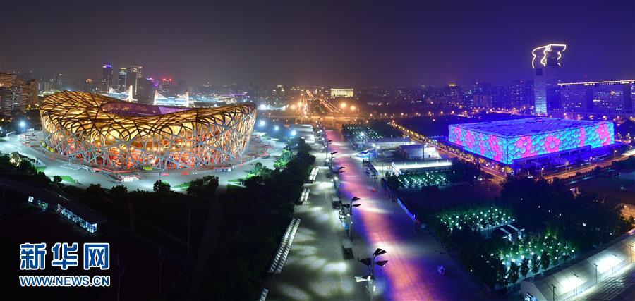 5月14日,“鳥巢”和“水立方”燈光璀璨。 當(dāng)晚,一場(chǎng)“空間光影秀”在北京上演。 新華社記者 李賀 攝