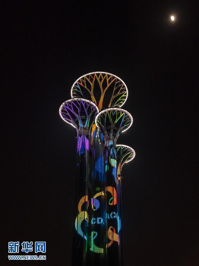 奧林匹克塔燈光璀璨(5月14日攝)。 當(dāng)晚,一場(chǎng)“空間光影秀”在北京上演。 新華社記者 李賀 攝