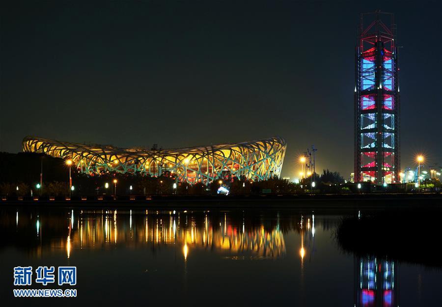“鳥巢”和玲瓏塔交相輝映(5月14日攝)。 當(dāng)晚,一場“空間光影秀”在北京上演。 新華社記者 陳建力 攝