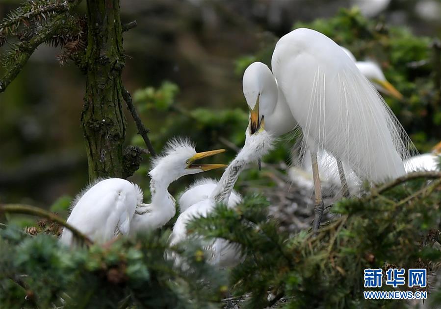 在江西省南昌市新建區(qū)象山森林公園內(nèi),白鷺和自己的雛鳥在一起(5月21日攝)。 近日,在江西省南昌市新建區(qū)象山森林公園內(nèi),已安家筑巢的大批鷺鳥陸續(xù)孵化出了后代。象山森林公園有著“鷺鳥王國(guó)”的美譽(yù),生態(tài)環(huán)境良好,每年都會(huì)吸引白鷺、蒼鷺、夜鷺等種類的鷺鳥飛抵棲息和繁衍后代。 新華社記者 彭昭之 攝