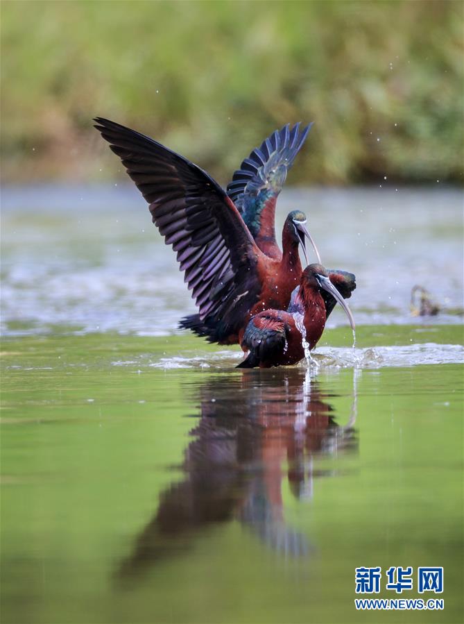 這是在漢江濕地公園嬉水的2只彩鹮(5月4日攝)。 近日,國家二級保護動物彩鹮現(xiàn)身陜西省漢中市漢江濕地公園濂水河與漢江交匯處。 據(jù)陜西師范大學(xué)生命科學(xué)院教授于曉平介紹,彩鹮在世界上的分布比朱鹮還要少,這幾年在云南發(fā)現(xiàn)得多一些,這3只彩鹮現(xiàn)身漢江濂水河畔,是陜西首次發(fā)現(xiàn)彩鹮蹤跡。 據(jù)了解,彩鹮是國家二級保護動物,屬鵜形目鹮科,體羽大部為青銅栗色,是珍稀鳥類朱鹮的“近親”,體型比朱鹮略小。 新華社發(fā)