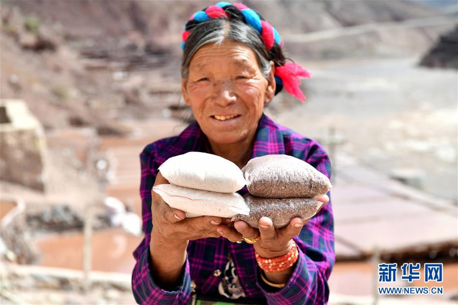 5月22日,西藏納西民族鄉(xiāng)加達(dá)村村民曲措展示所賣鹽類商品。位于西藏昌都芒康縣瀾滄江畔的古鹽田,至今仍保持最原始的手工曬鹽方式。據(jù)史料記載,唐朝時期當(dāng)?shù)鼐烷_始曬鹽。鹽田在瀾滄江兩岸依山而建,由多根木柱搭架,架上用透水性強(qiáng)的泥土鋪成平面夯實,當(dāng)?shù)鼐用駨臑憸娼系柠}井、鹽池中取出鹵水倒入鹽田,經(jīng)陽光蒸曬、風(fēng)干,結(jié)晶成鹽。遠(yuǎn)遠(yuǎn)望去,鹽田錯落有致,田中鹵水宛若鏡面,形成壯麗奇觀。新華社記者李鑫 攝