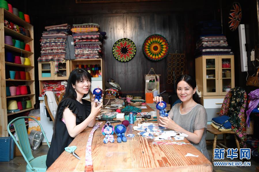 5月26日,在石舍村共同經(jīng)營“三只蝸牛”手工藝品商店和客棧的姐妹陳紫畫(右)、陳莫寒在展示制作的手工藝品。 石舍村是浙江省桐廬縣富春江鄉(xiāng)村慢生活體驗區(qū)中的三個村落之一,位置偏僻,依溪而居,風景秀美。近年來,石舍村結合古建筑保護工作,在清潔、美化村莊的基礎上,對一些廢棄古建筑進行修繕,引入咖啡館、民宿等文化創(chuàng)意類項目,優(yōu)良的生態(tài)環(huán)境和濃郁的文化氛圍吸引大批游客前來體驗,小山村走上了一條發(fā)展美麗經(jīng)濟之路。2018年,石舍村接待游客10萬8千余人次,旅游經(jīng)營凈收入1260余萬元。 新華社記者 黃宗治 攝