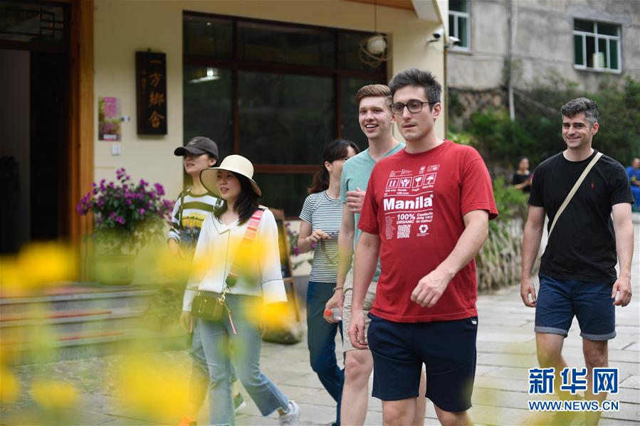 中外游客在石舍村游覽(5月25日攝)。 石舍村是浙江省桐廬縣富春江鄉(xiāng)村慢生活體驗區(qū)中的三個村落之一,位置偏僻,依溪而居,風(fēng)景秀美。近年來,石舍村結(jié)合古建筑保護(hù)工作,在清潔、美化村莊的基礎(chǔ)上,對一些廢棄古建筑進(jìn)行修繕,引入咖啡館、民宿等文化創(chuàng)意類項目,優(yōu)良的生態(tài)環(huán)境和濃郁的文化氛圍吸引大批游客前來體驗,小山村走上了一條發(fā)展美麗經(jīng)濟(jì)之路。2018年,石舍村接待游客10萬8千余人次,旅游經(jīng)營凈收入1260余萬元。 新華社記者 黃宗治 攝