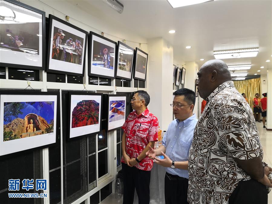 5月29日,在斐濟(jì)蘇瓦,中國駐斐濟(jì)大使錢波(中)與斐濟(jì)中國文化中心主任鄧先富(左)陪同嘉賓觀看展出的精美圖片。 為期5天的中國旅游文化周及美食節(jié)活動29日晚在斐濟(jì)首都蘇瓦拉開帷幕,來自中斐兩國的約200名嘉賓出席了開幕式。開幕式上,嘉賓們觀看了反映中國寧夏自然風(fēng)光和人文風(fēng)貌的精美圖片以及中國非物質(zhì)文化遺產(chǎn)展,來自寧夏的藝術(shù)家表演了精彩文藝節(jié)目,來自江蘇的大廚為嘉賓帶來了淮揚(yáng)菜。 新華社記者 張永興 攝