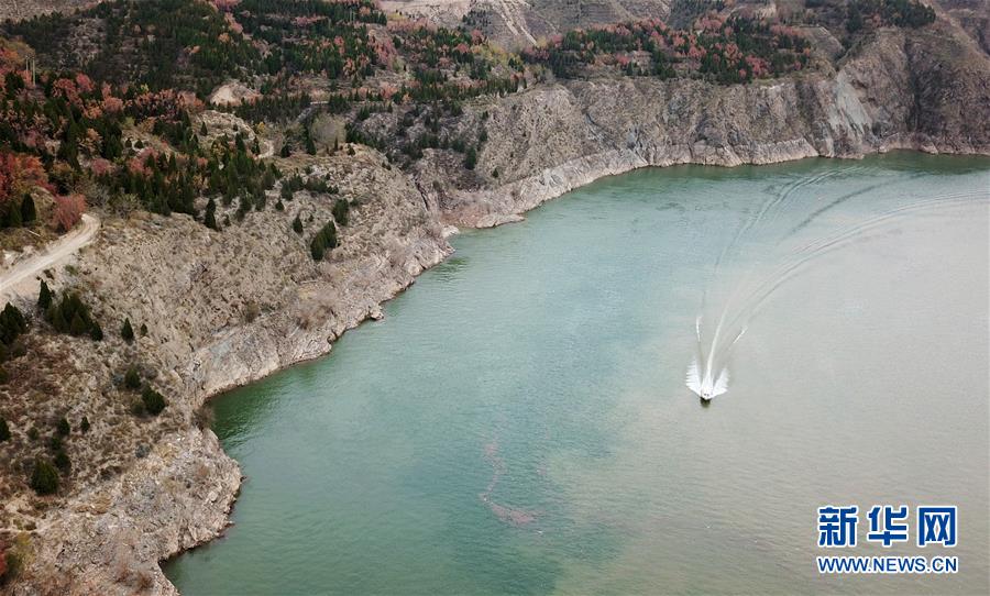 10月24日,一艘快艇從劉家峽水庫庫區(qū)駛過(無人機(jī)拍攝)。 新華社記者 陳斌 攝