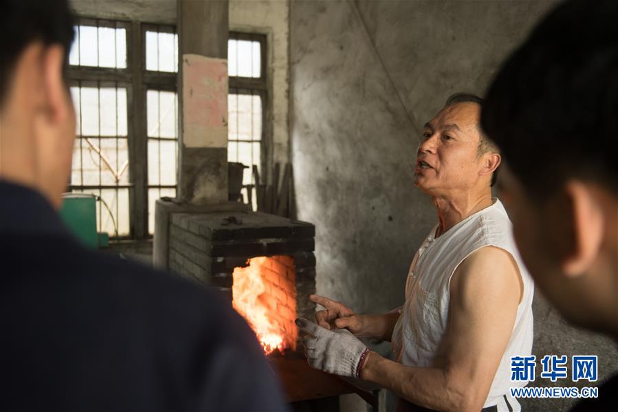 5月21日,鄭國榮在“古越劍鋪”向徒弟們傳授寶劍淬火技藝。 新華社記者 翁忻旸 攝