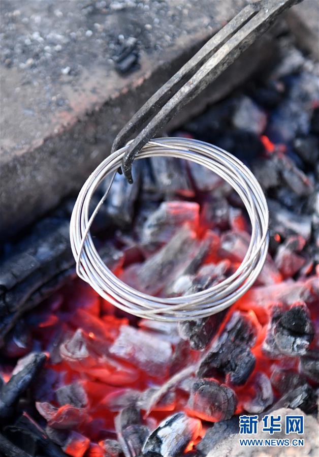 5月29日,在廣西融水苗族自治縣融水鎮(zhèn),銀匠陳四先在煅燒一條銀絲準備飾物。