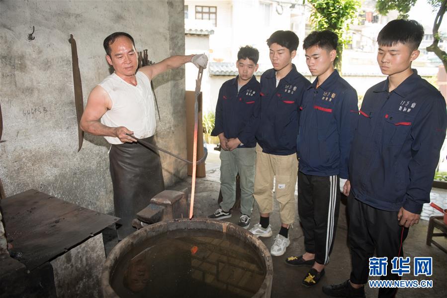5月21日,鄭國榮在“古越劍鋪”向徒弟們傳授寶劍淬火技藝。 新華社記者 翁忻旸 攝
