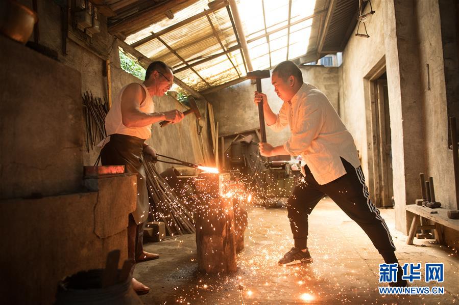 5月21日,鄭國(guó)榮(左)和兒子在“古越劍鋪”鍛打坯料。 新華社記者 翁忻旸 攝
