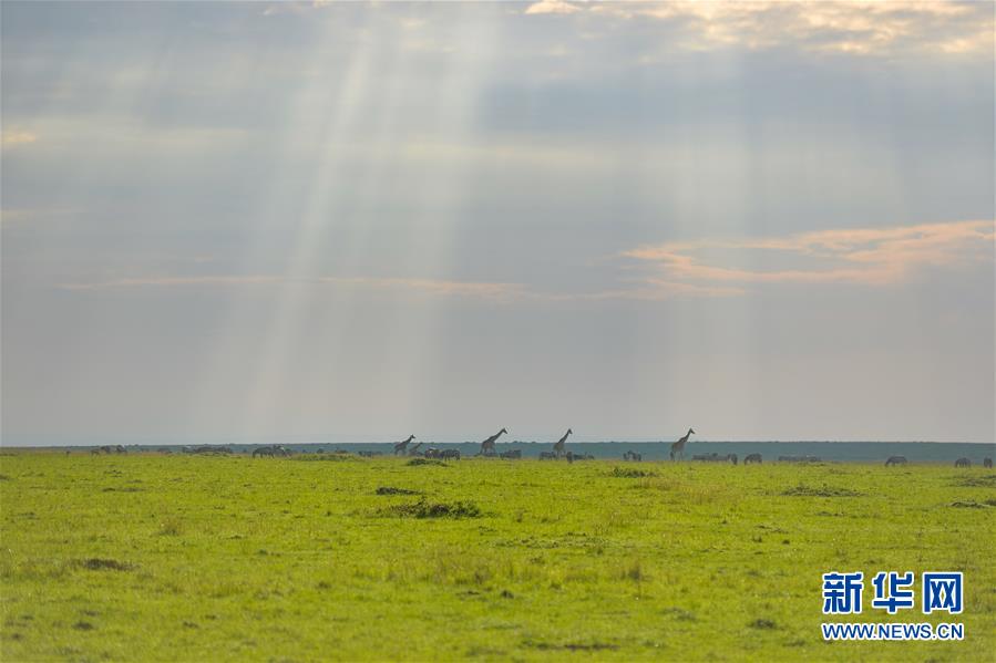 6月18日,在肯尼亞馬賽馬拉國家保護(hù)區(qū),長頸鹿在草原上覓食。 新華社記者 李琰 攝
