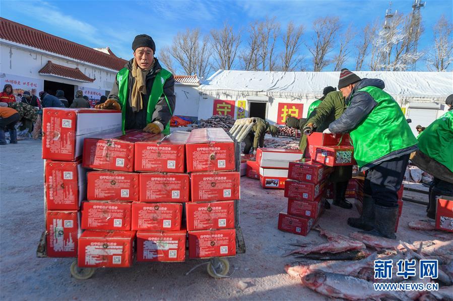 12月27日,在吉林松原查干湖漁場(chǎng),工人們將魚(yú)裝箱。 新華社記者張楠攝