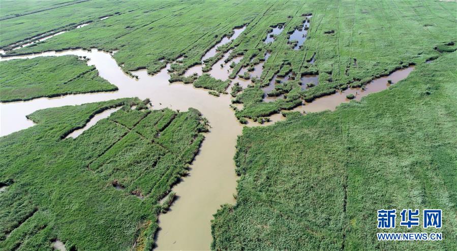 這是天津市寧河區(qū)七里海濕地內(nèi)蘆葦和水面形成的圖案(6月22日無人機(jī)拍攝)。