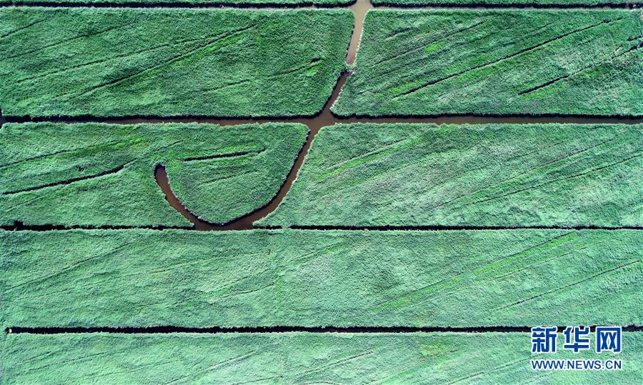 這是天津市寧河區(qū)七里海濕地內蘆葦和水面形成的圖案(6月22日無人機拍攝)。新華社記者 岳月偉 攝