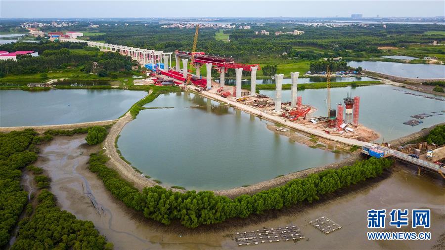 這是7月6日無人機(jī)拍攝的湛江調(diào)順跨海大橋東岸移動模架施工現(xiàn)場。 新華社記者 劉大偉 攝