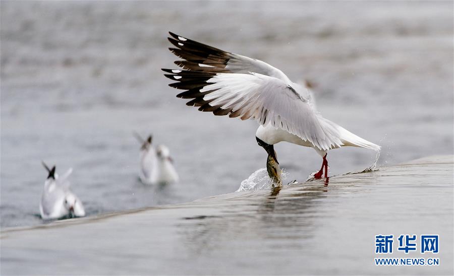 7月6日,在青海省剛察縣沙柳河里,一只棕頭鷗捕捉到一只躍起的湟魚。 新華社記者 吳剛攝