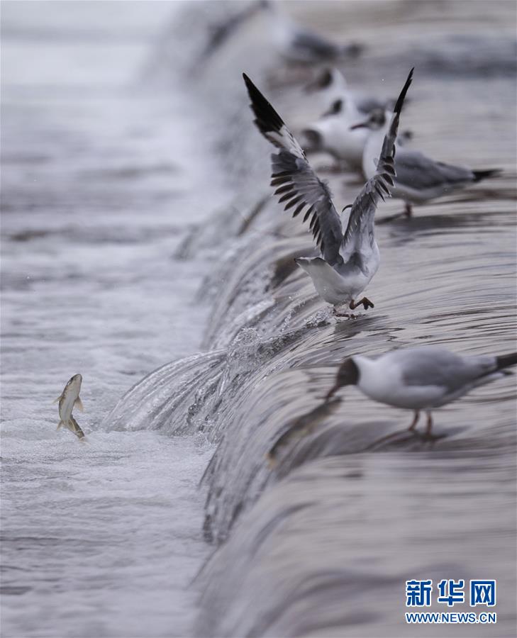7月6日,在青海省剛察縣沙柳河里,幾只棕頭鷗在捕捉躍起的湟魚。 新華社記者 費(fèi)茂華攝