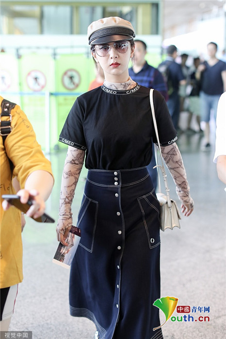 2019年7月25日,北京,楊紫現(xiàn)身機(jī)場(chǎng)。她穿黑色短T配牛仔裙變時(shí)髦女郎,戴報(bào)童帽架墨鏡”港風(fēng)女sir“即視感,人氣爆棚。