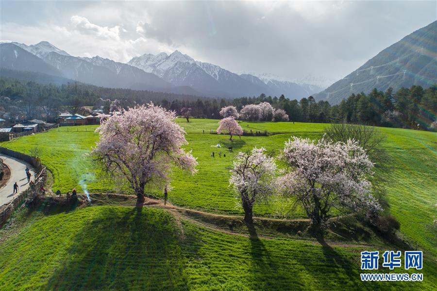 西藏林芝波密縣境內(nèi)桃花盛開的田園風光(4月5日無人機拍攝)。