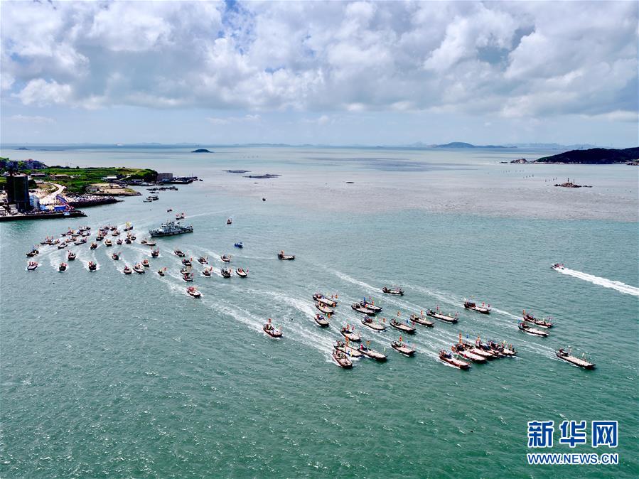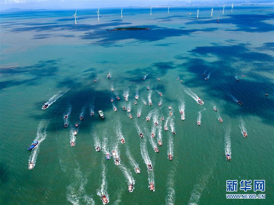 8月3日,在首屆福清開(kāi)漁節(jié)上,漁船駛向大海(無(wú)人機(jī)拍攝)。新華社記者姜克紅攝