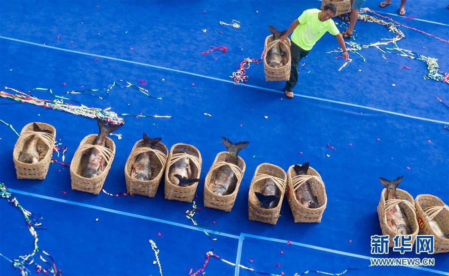 7月27日,在西昌邛海,漁民提著捕到的大魚參加比賽。新華社記者江宏景攝