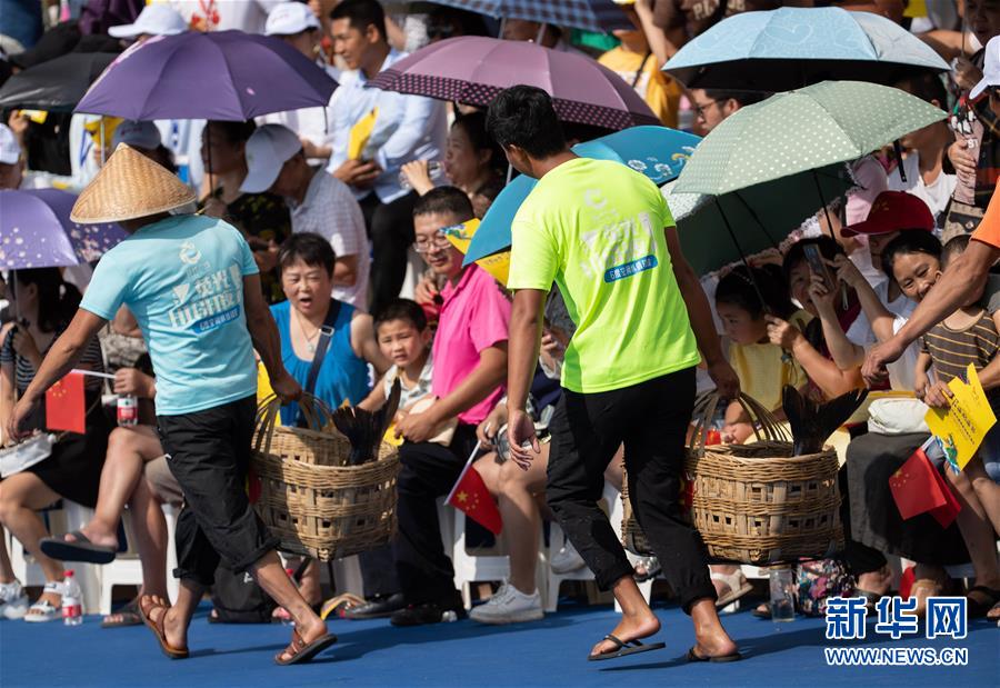 7月27日,在西昌邛海,漁民提著捕到的大魚準(zhǔn)備參加比賽。新華社記者江宏景攝