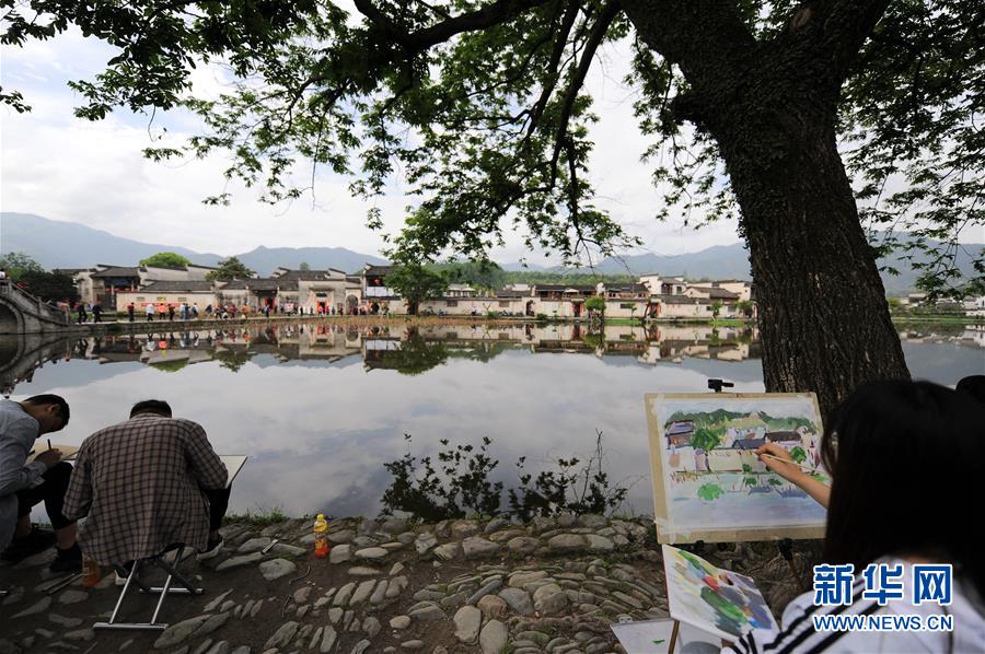 4月24日,繪畫愛好者在宏村風(fēng)景區(qū)寫生。近日,隨著氣溫升高,位于安徽省黟縣的古村落西遞和宏村春意盎然,景色如畫。大批繪畫愛好者前來寫生,用畫筆描繪古村春色。 新華社記者 任鵬飛 攝