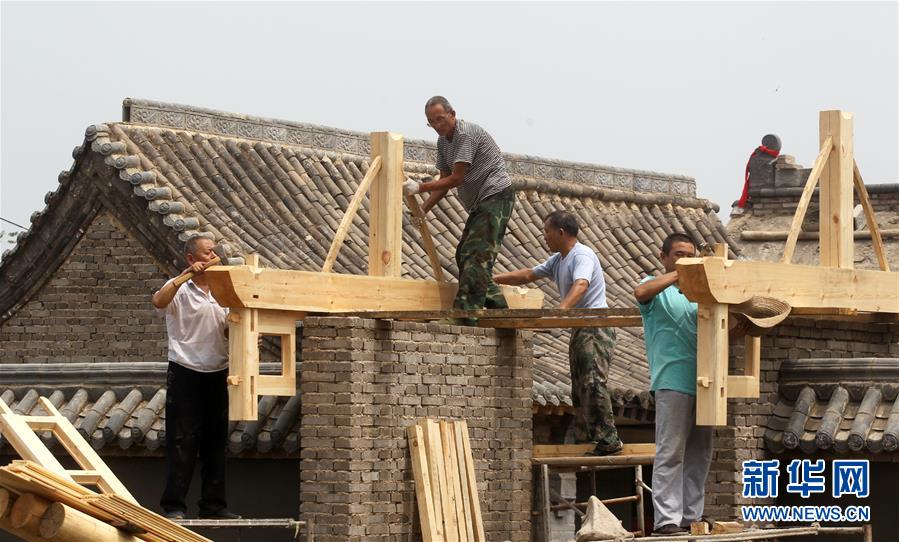 8月7日,在石家莊市井陘礦區(qū)橫西村,工作人員在組裝門(mén)樓建筑木架。 新華社記者駱學(xué)峰攝