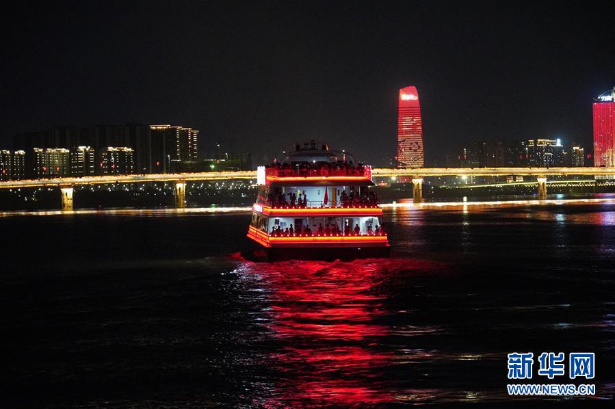 在江西南昌,游客在游輪上觀賞夜景(8月6日攝)。 新華社記者周密 攝