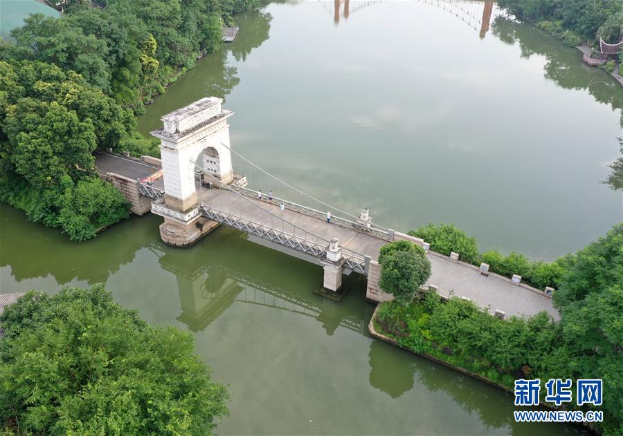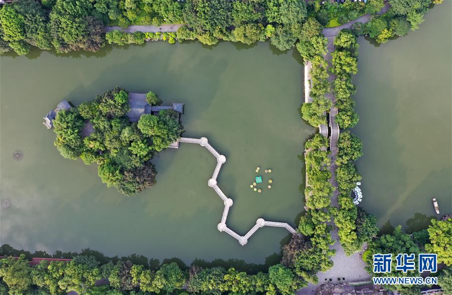 桂林市榕湖上的橋梁(7月1日無人機拍攝)。 夏日時節(jié),廣西桂林市區(qū)內(nèi)的榕湖、杉湖、桂湖、木龍湖等地綠樹成蔭、景色迷人。 新華社記者陸波岸攝