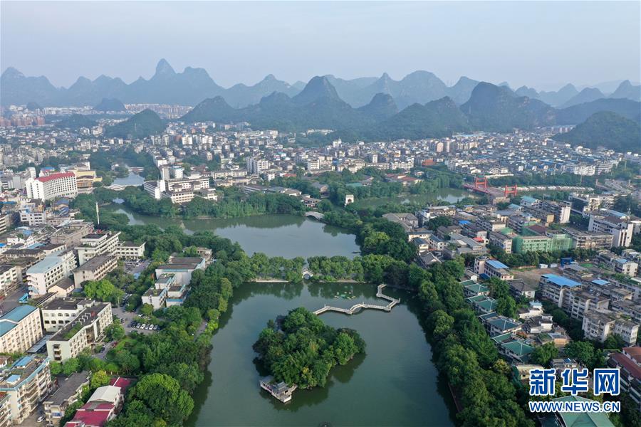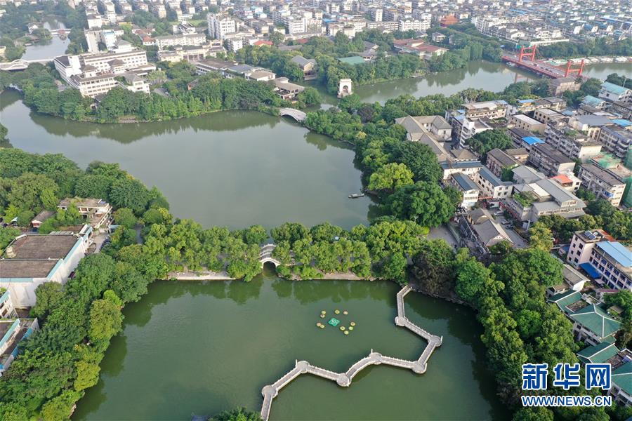 桂林市榕湖附近景觀(7月1日無人機拍攝)。 夏日時節(jié),廣西桂林市區(qū)內(nèi)的榕湖、杉湖、桂湖、木龍湖等地綠樹成蔭、景色迷人。 新華社記者陸波岸攝