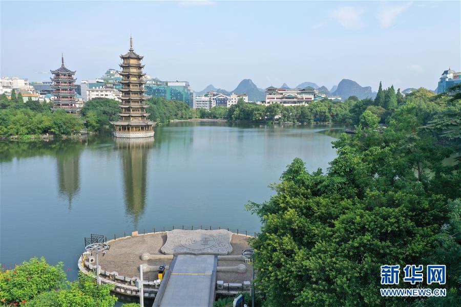 桂林市杉湖景觀(7月1日無人機拍攝)。 夏日時節(jié),廣西桂林市區(qū)內(nèi)的榕湖、杉湖、桂湖、木龍湖等地綠樹成蔭、景色迷人。 新華社記者陸波岸攝