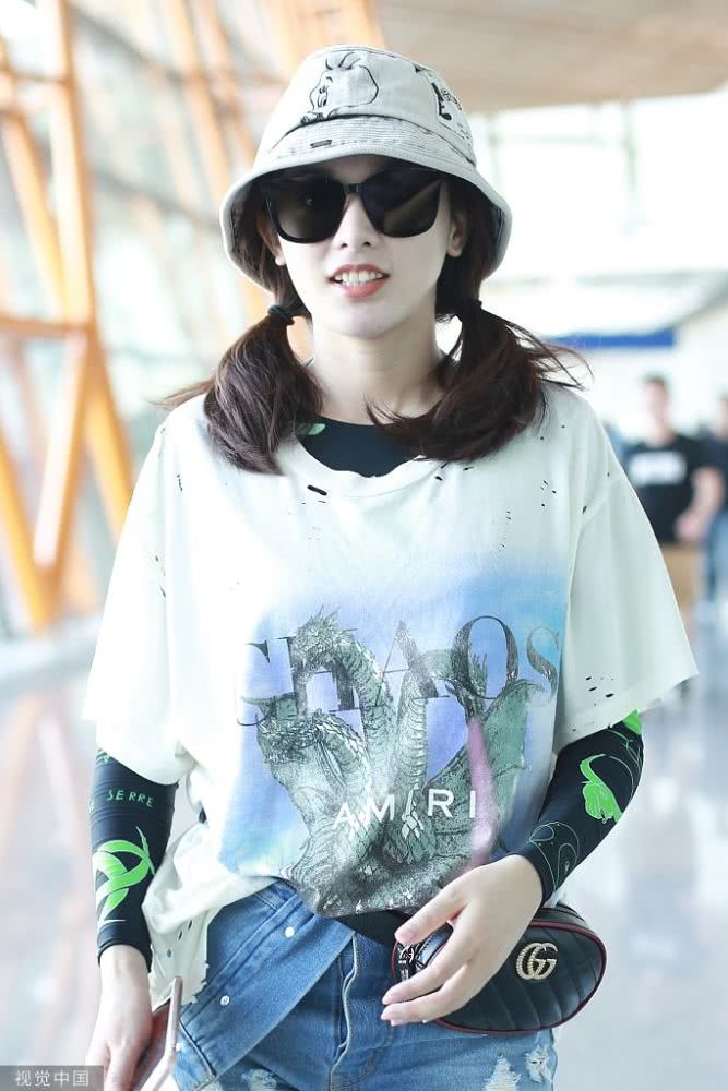 內(nèi)地女星彭小苒現(xiàn)身機場,穿印花T恤牛仔短褲,白色馬丁靴很時髦