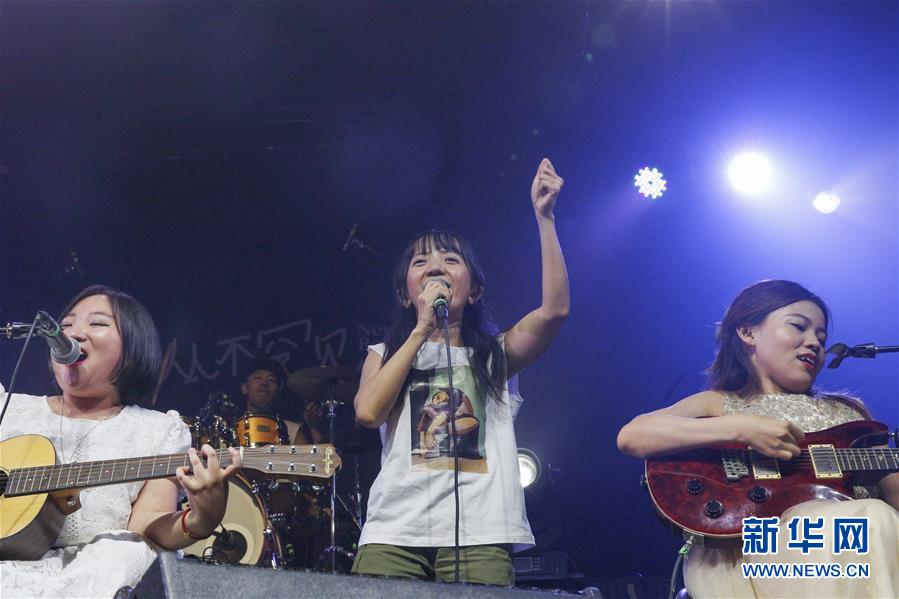 8月14日,8772樂隊發(fā)起人、隊長王奕鷗(中)和樂隊成員崔瑩(左)、程利婷在演唱會上表演。新華社記者張玉薇攝