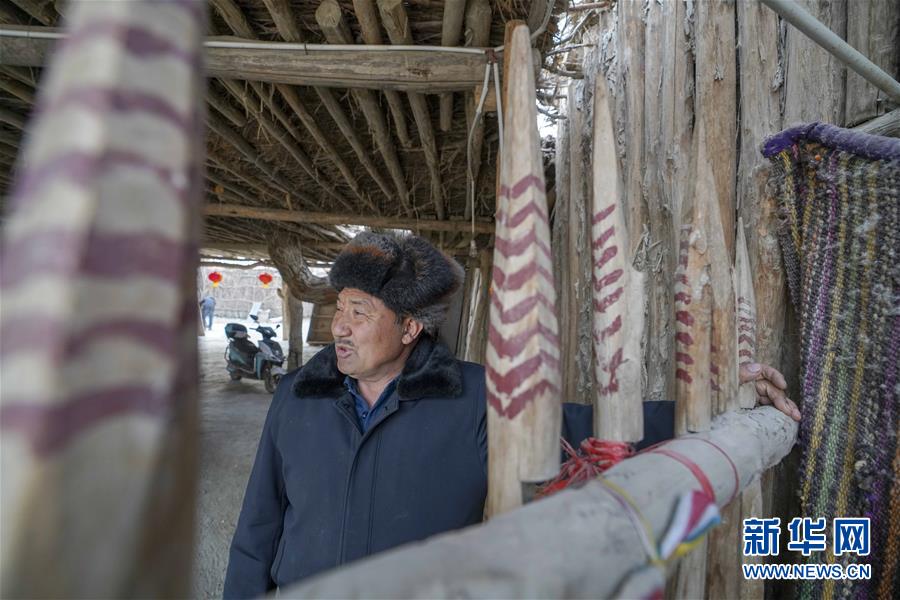 阿木東·艾不東在羅布人村寨的家里(1月29日攝)。他家的裝修都突出了當(dāng)?shù)匚幕?。新華社記者 趙戈 攝