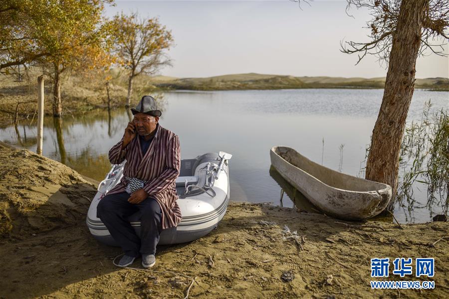 在羅布人村寨,阿木東·艾不東坐在湖邊接電話(2018年10月16日攝)。在旅游旺季,游客會通過電話提前向阿木東預(yù)約羅布烤魚。新華社記者 趙戈 攝