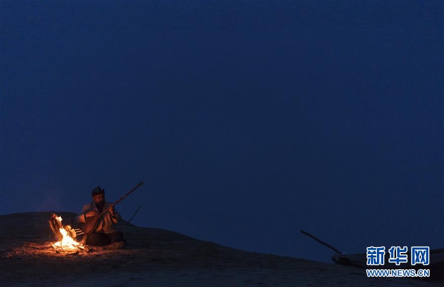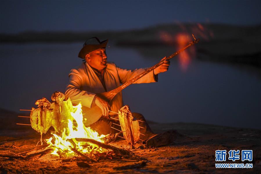 在羅布人村寨,阿木東·艾不東在沙漠里的一處海子旁彈奏樂器,等待烤魚烤熟(4月11日攝)。新華社記者 盧燁 攝
