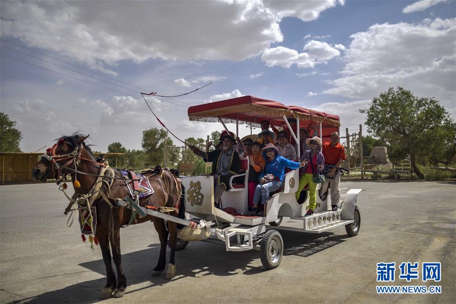 游客在羅布人村寨乘坐馬車游覽(6月19日攝)。新華社記者 趙戈 攝