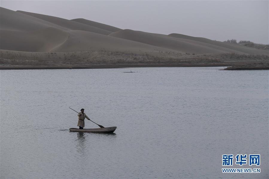 在羅布人村寨,阿木東·艾不東劃著卡盆準(zhǔn)備去捕魚(2018年10月16日攝)。新華社記者 趙戈 攝